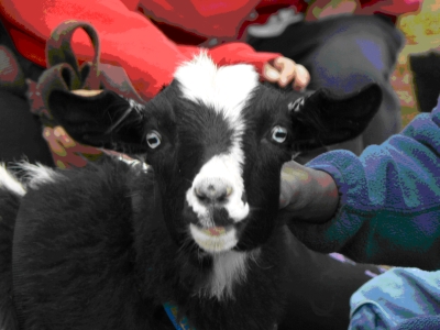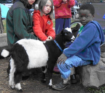 NOK No-Knees Zoo George DOB 03-02-09 Our wether George is the one who started it all! He has not only gone camping with the family, but now also has his own fan club. When friends hear we are coming for a visit, his presence is always requested! The middle and right photos show George with some of his fans.