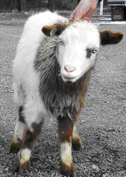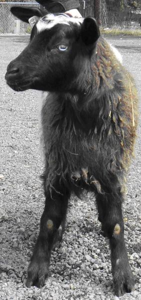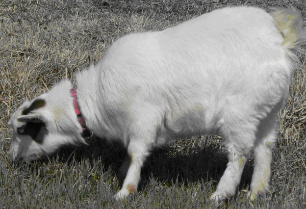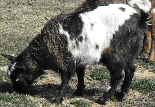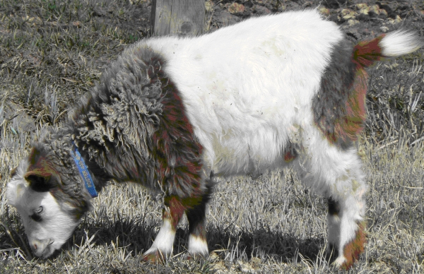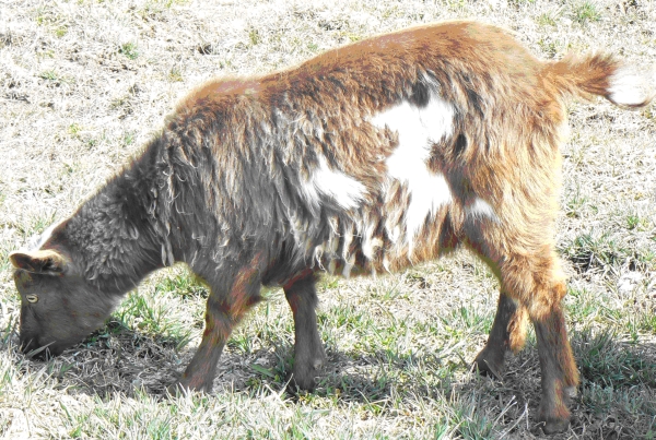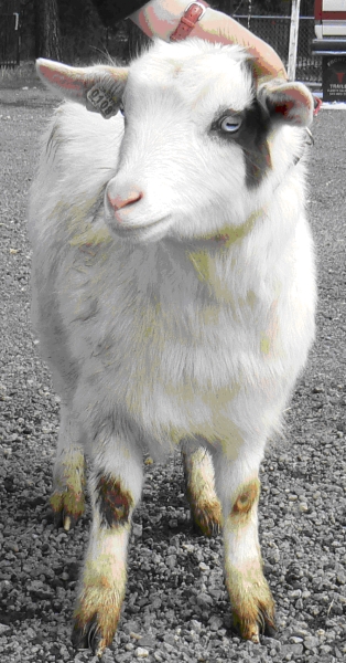 NOK No-Knees Zoo Spectacles DOB 03-07-09 So named because of the brown blotches around each blue eye, Spectacles is our daughter’s doe. She has the best muscling of all of the does, and being handled so frequently, is also one of the first to fun to the gate to be let out for a romp.